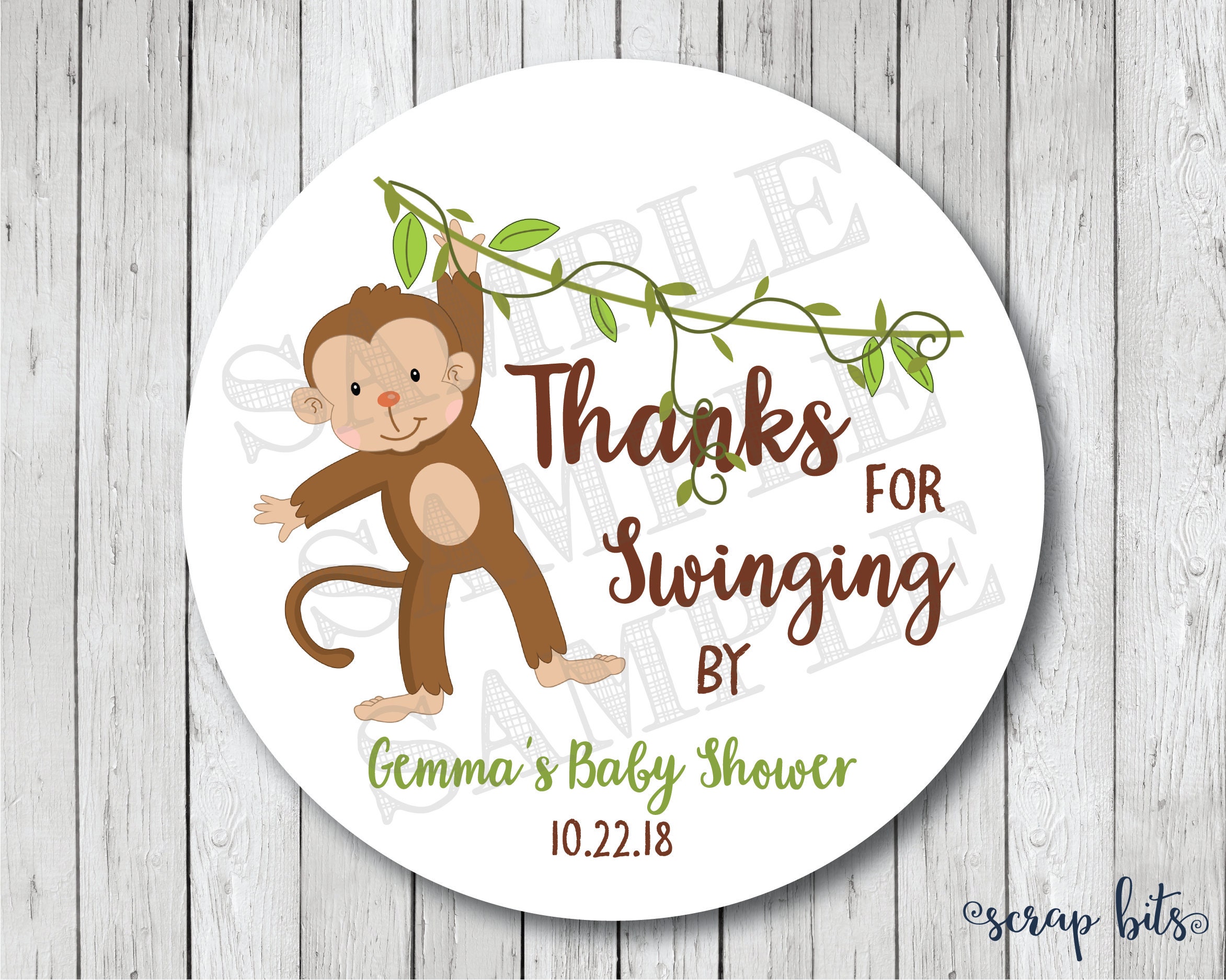 Thank You for Swinging By, Personalized Monkey Baby Shower Stickers, Monkey Tags, Thanks for Swinging By My Party