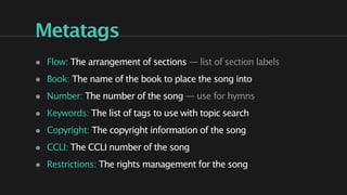 OnSong | Manual | Metadata OnSong automatically assigns the first line of a text file as the title of the song if it is not in the metatag format. In addition, the second line is considered the artist/byline of the song unless a metatag is defined. The following is an example of a typical song metadata section that sets the title and artist as the first and second lines ...